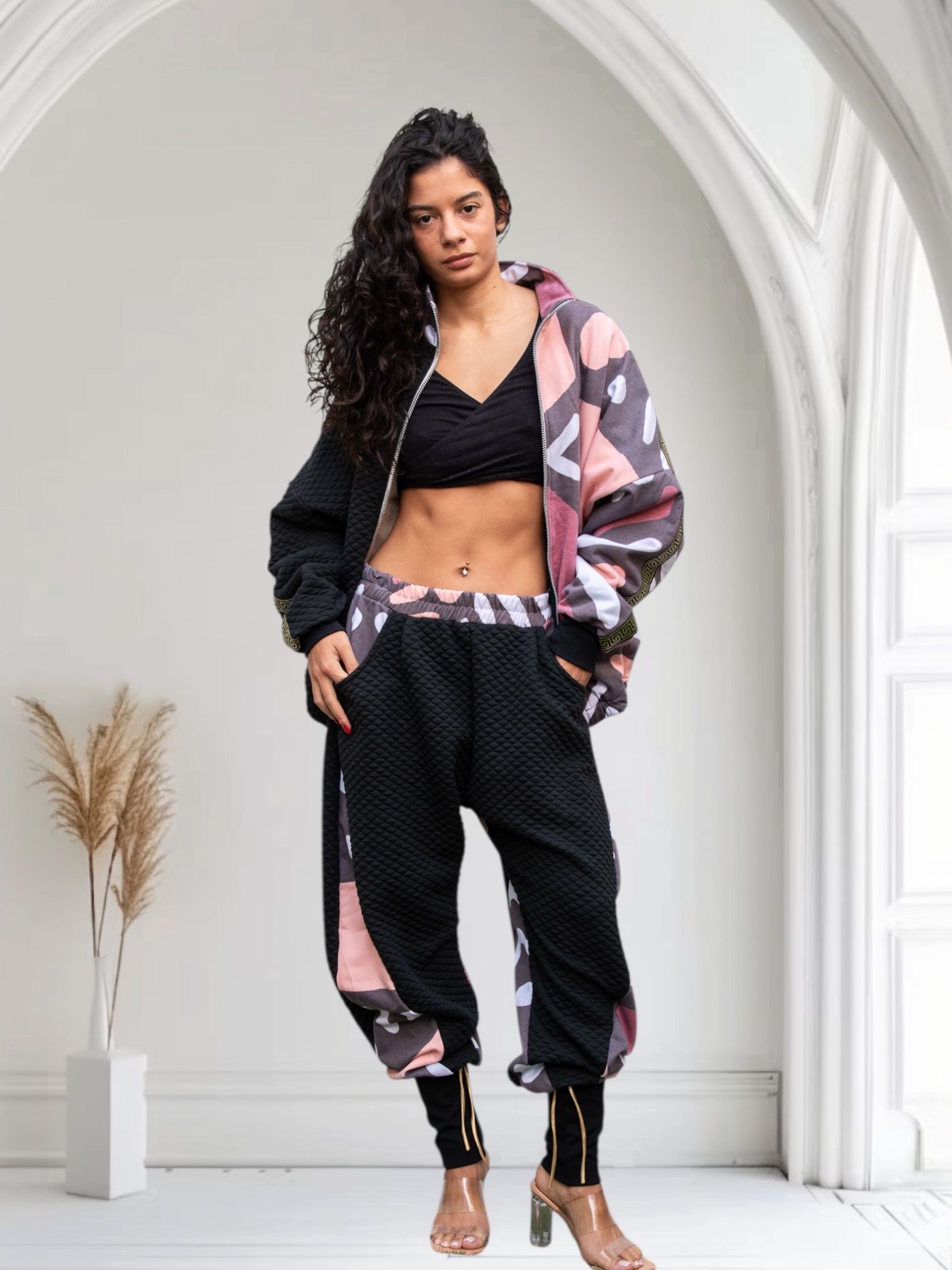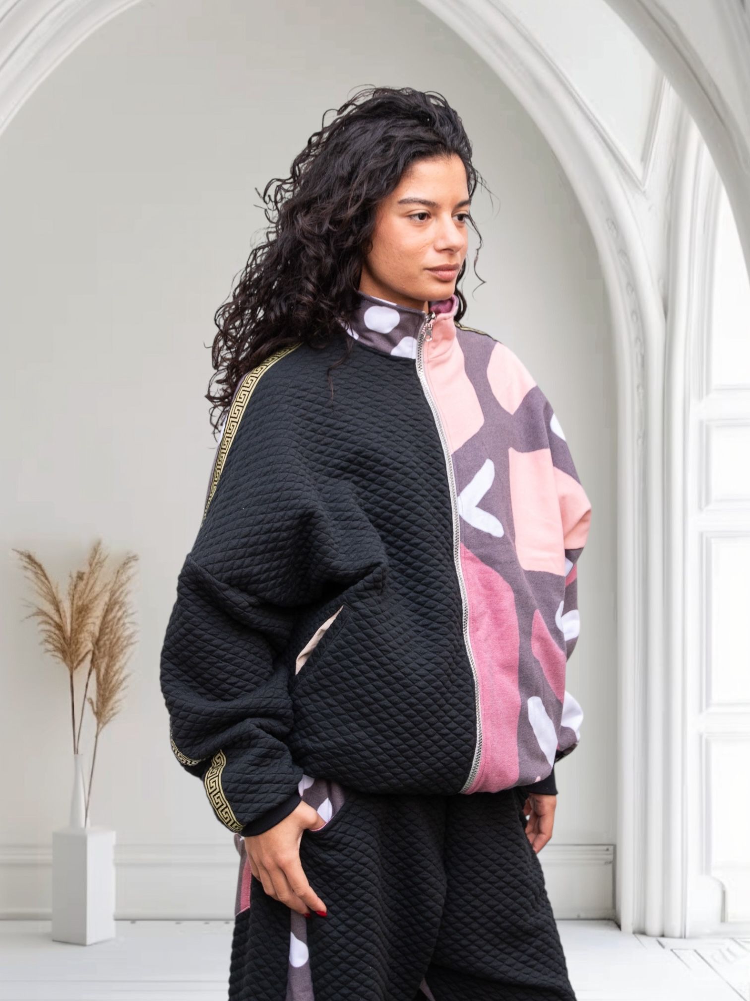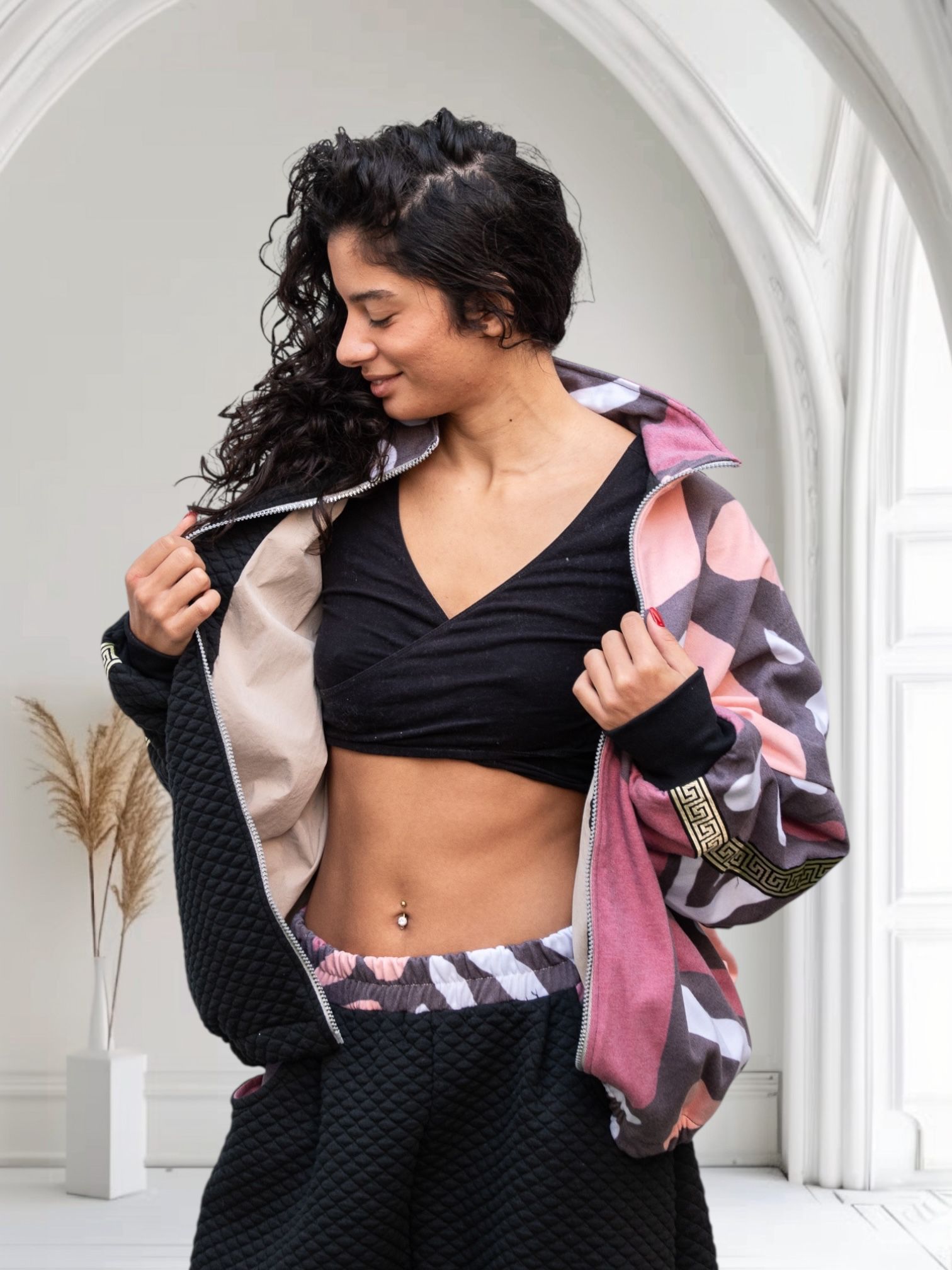 El diseño reversible permite dos energías en una sola prenda: un lado más sobrio y urbano, y otro más expresivo y artístico. El acolchado aporta estructura, abrigo ligero y textura, convirtiéndola en una pieza funcional para el día a día creativo.