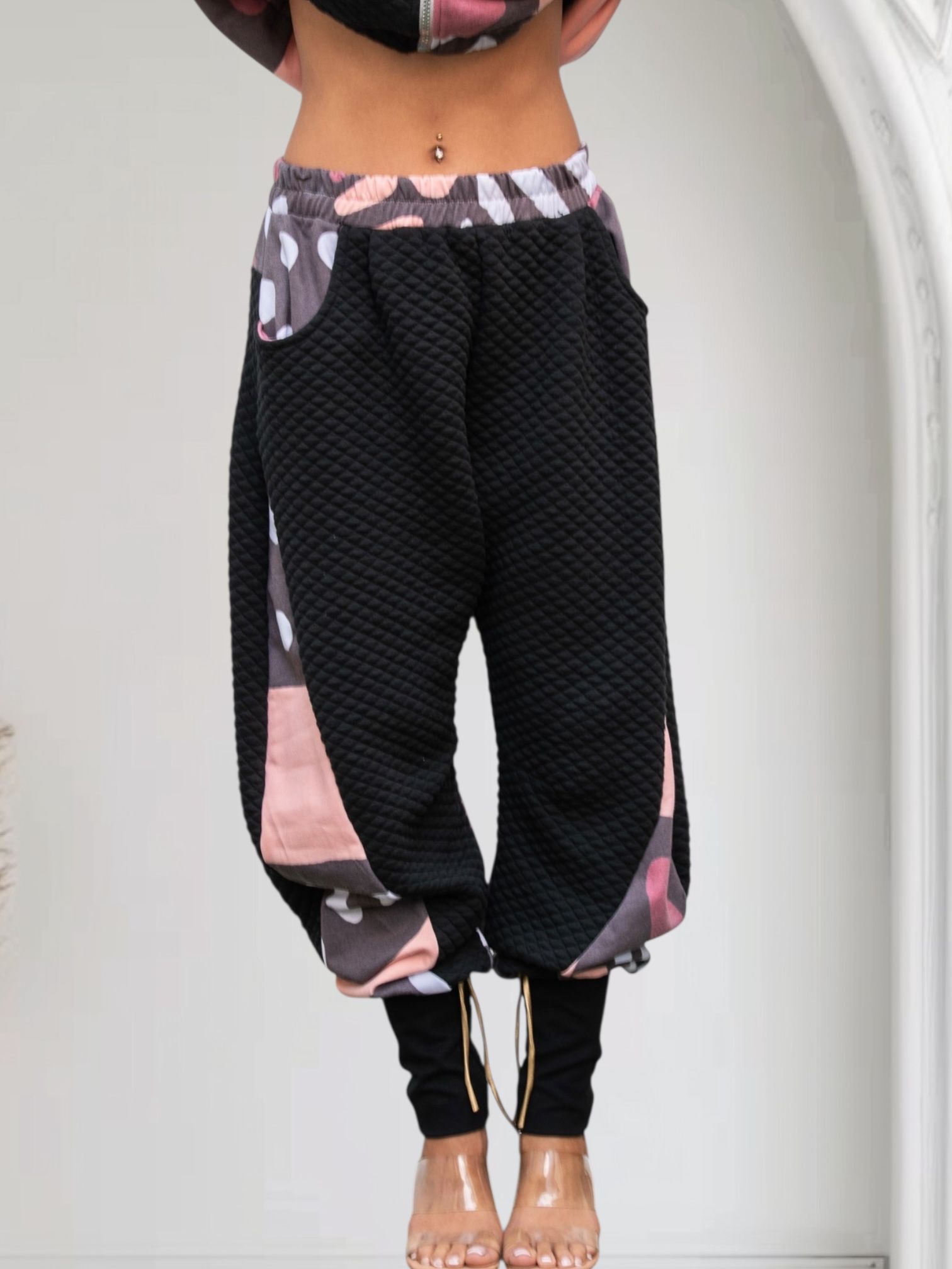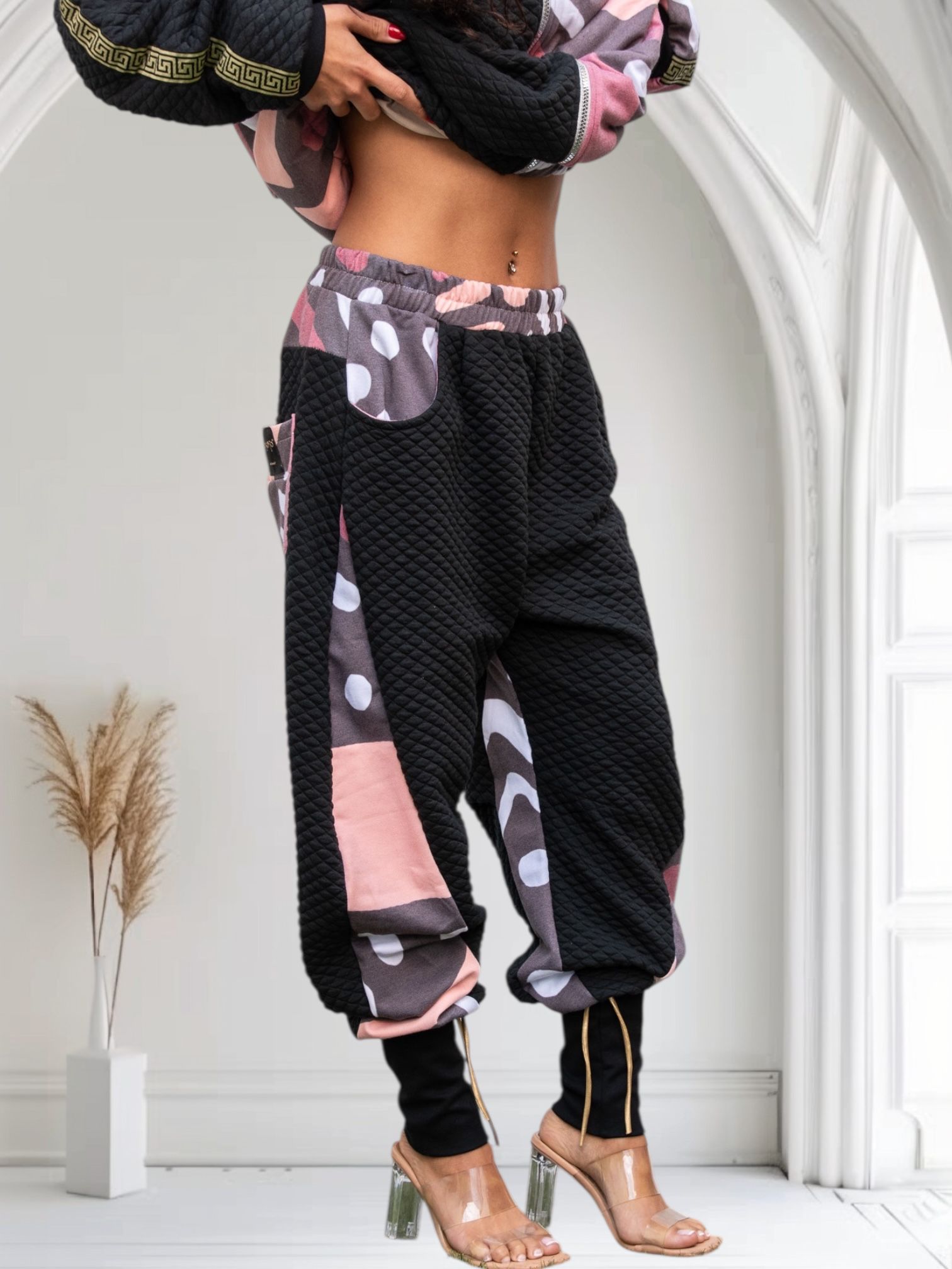 La combinación de tejido acolchado negro con paneles estampados aporta estructura, abrigo ligero y una estética artística con carácter. La cintura elástica se adapta al cuerpo con suavidad, mientras que los bajos ajustables permiten jugar con el volumen y el estilo, tanto en looks urbanos como escénicos.