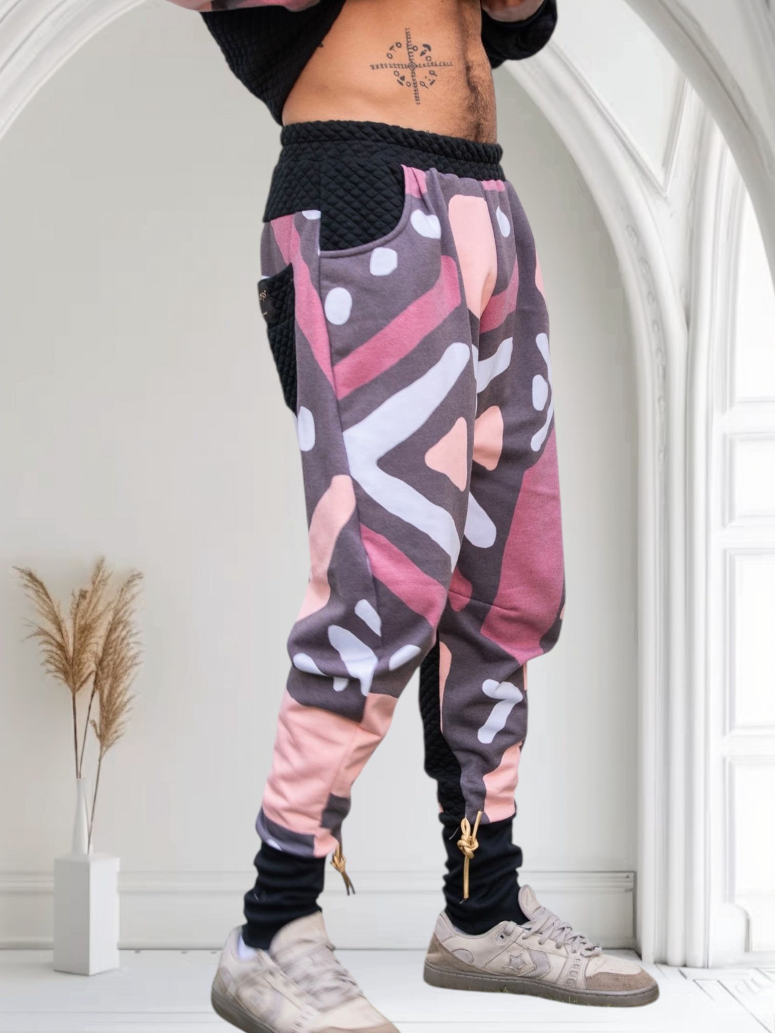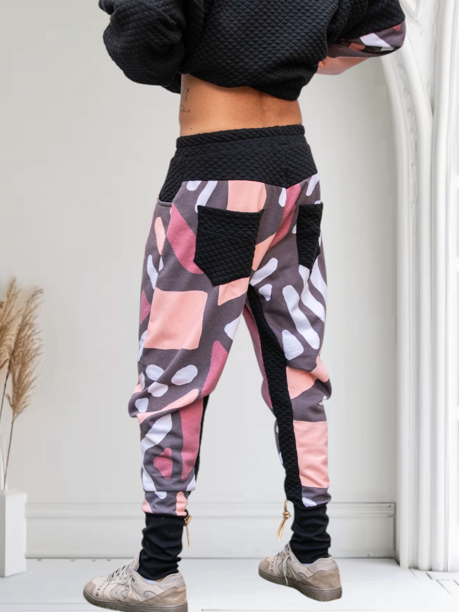 Estampado abstracto de inspiración urbana en tonos rosa empolvado, gris, negro y nude, combinado con paneles negros acolchados que aportan contraste, textura y carácter. Cada pieza transmite una estética artística y contemporánea, fiel al ADN de Yosoyo Brand.