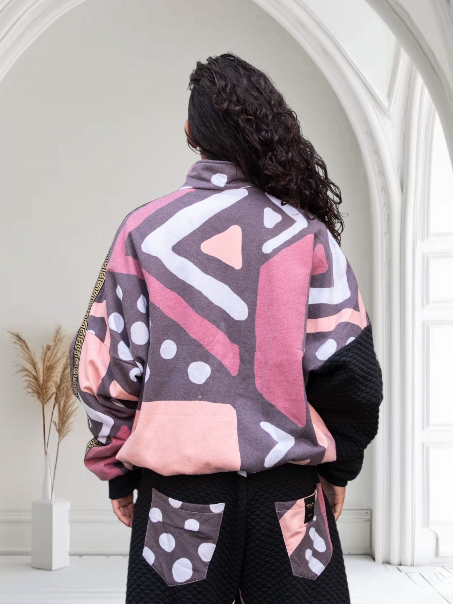 El diseño reversible permite dos energías en una sola prenda: un lado más sobrio y urbano, y otro más expresivo y artístico. El acolchado aporta estructura, abrigo ligero y textura, convirtiéndola en una pieza funcional para el día a día creativo.