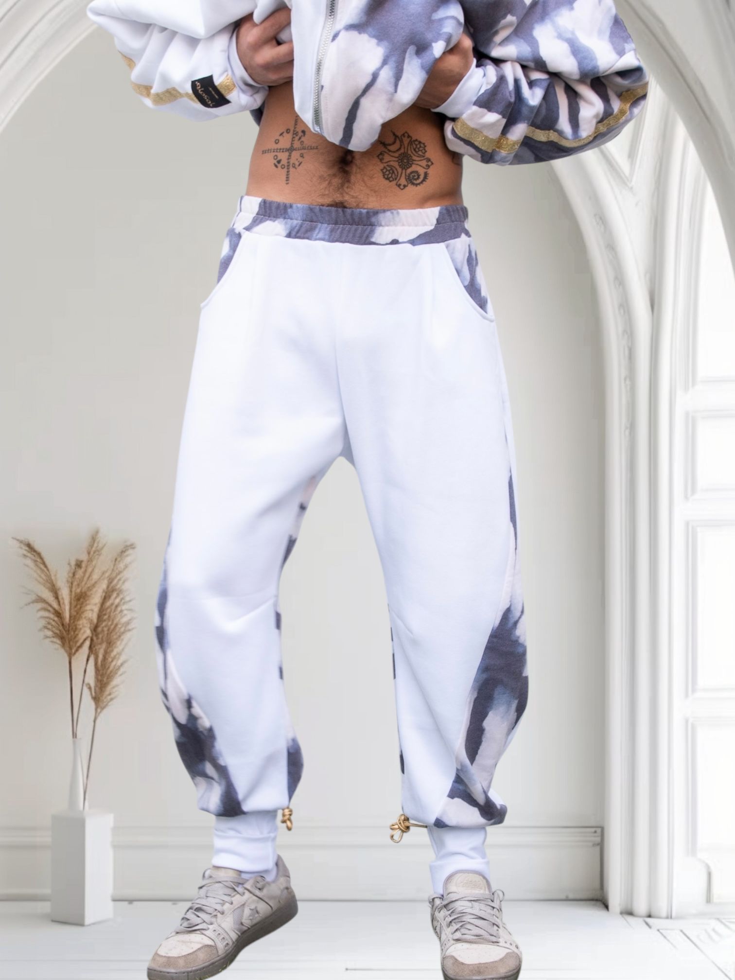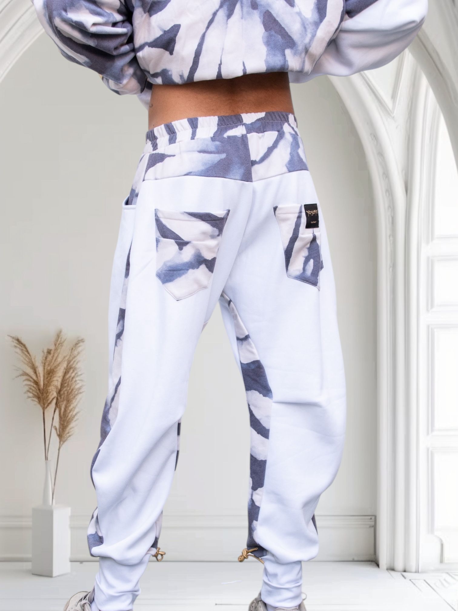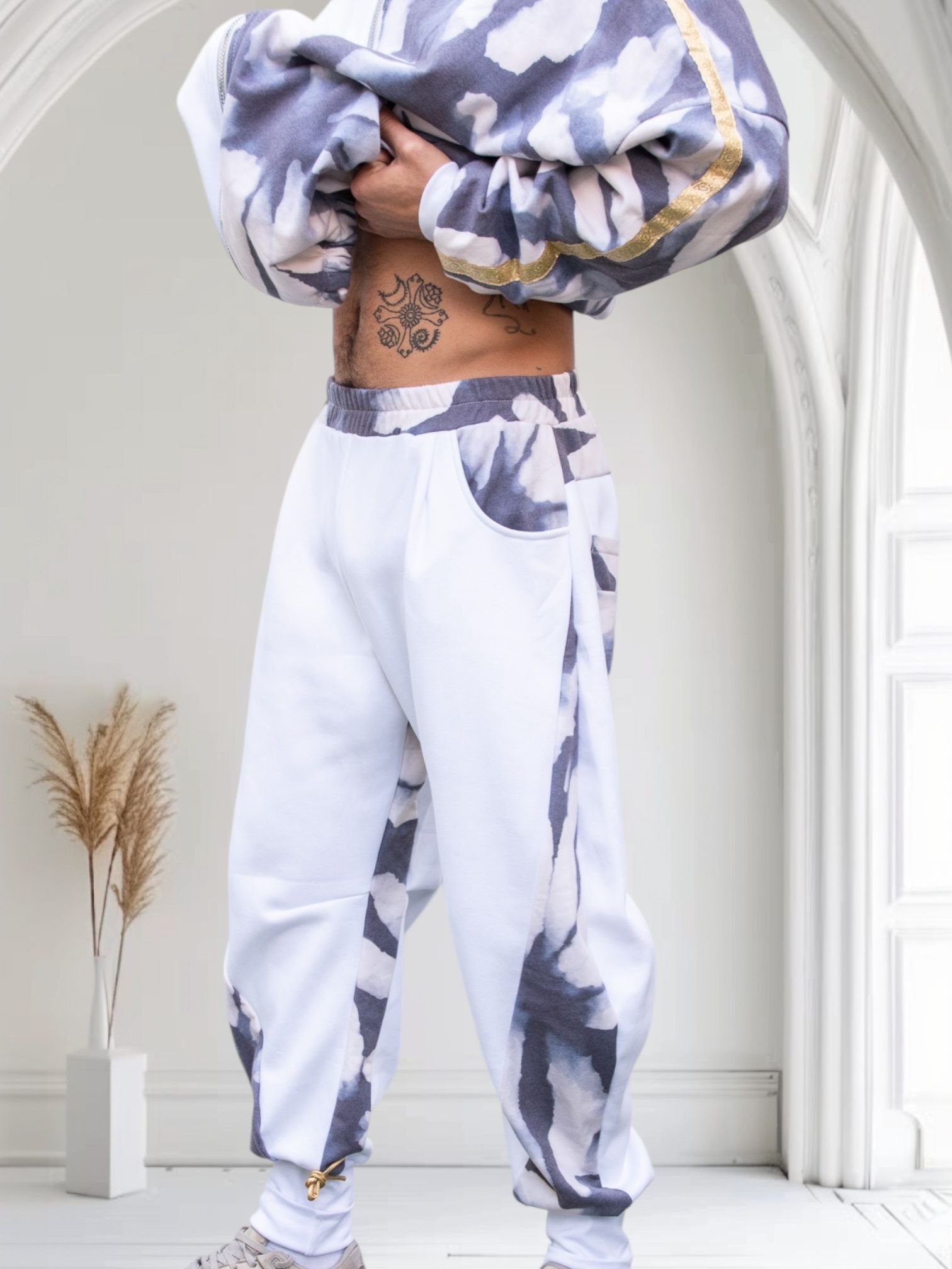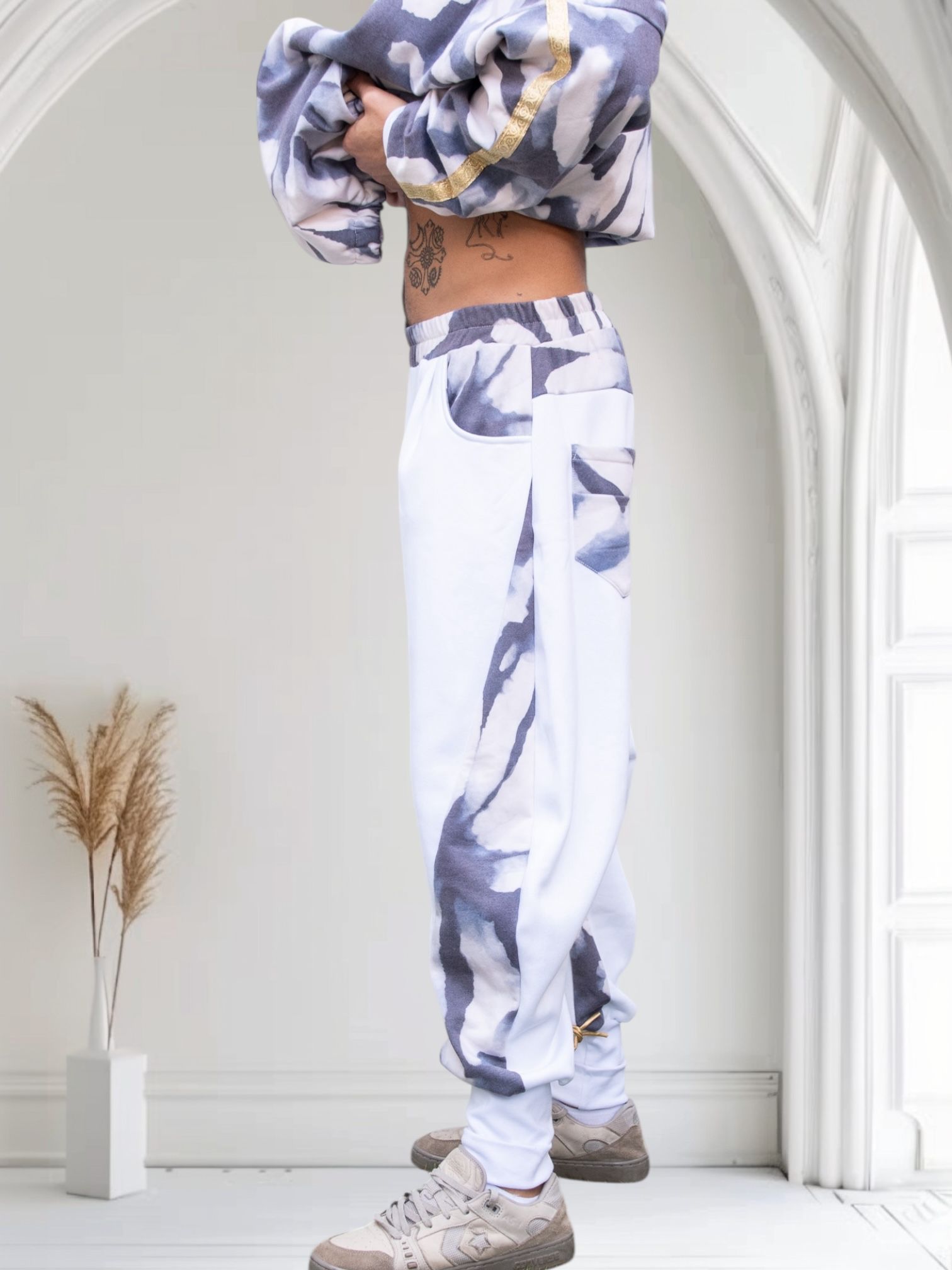 Confeccionada en tejido suave y resistente, combina el blanco con el estampado exclusivo Corazón Blue, un diseño que evoca fluidez, calma y conexión emocional. Los detalles en cinta dorada a lo largo de las mangas aportan carácter y contraste, reforzando su presencia escénica y contemporánea.